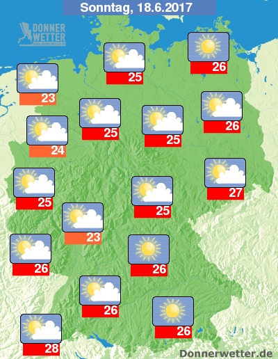 Am Sonntag ist es über der Republik verbreitet heiter bis sonnig, nur hier und da können auch mal mehr Wolken durchziehen, dabei bleibt es aber trocken. Die Temperatur steigt auf überwiegend sommerliche 23 bis 28 Grad.