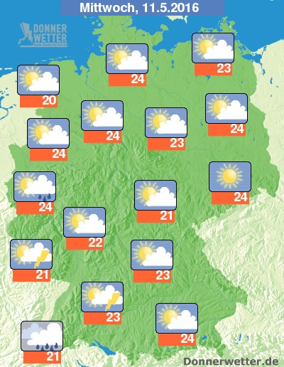Die Wochenmitte beschert vor allem dem Norden und Osten des Landes einen nochmals trockenen und milden Maitag. Die Temperaturen erreichen hier Höchstwerte um 20 Grad C in Ostfriesland und um 24 Grad C in Dresden.