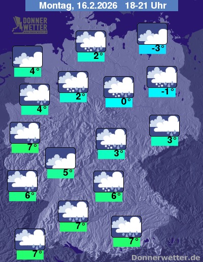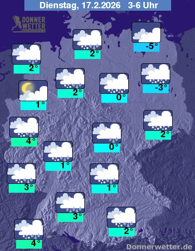 In der Nacht zum Dienstag bleibt es weiterhin dicht bewölkt und nur selten kann es mal ein wenig auflockern, stattdessen fällt verbreitet Regen, Schneeregen oder Schnee. Oft ist es auch neblig-trüb. Die Tiefstwerte liegen bei 4 Grad am Oberrhein und bis -5 Grad in Neubrandenburg.