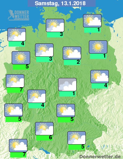 Heute hält sich vor allem vormittags oft starke Bewölkung, vielerorts kann sich im Tagesverlauf aber auch die Sonne durchsetzen, gebietsweise wird es sogar sonnig. Es bleibt trocken bei Werten zwischen 1 Grad an der Ostsee und bis 7 Grad im Oberrheingraben.