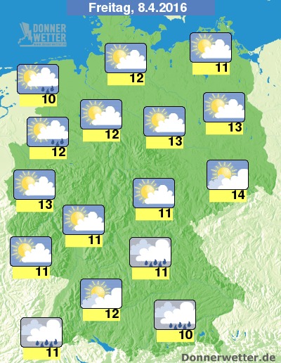 Heute bleibt es im Südosten und im äußeren Süden meist stark bewölkt und es fällt gelegentlich Regen. In den anderen Landesteilen ist es hingegen teils heiter, zum Teil ziehen einige Wolken durch, dazu bleibt es weitgehend trocken. Im Nordwesten ziehen jedoch häufig auch dichte Wolken durch und es bilden sich einzelne Schauer. Die Temperatur steigt auf 10 Grad in Augsburg und bis 14 Grad in der Lausitz.