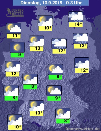 In der Nacht setzt sich zum Teil ergiebiger Regen im Nordosten des Landes weiter fort, unter dichten Wolken sinken die Tiefstwerte hier kaum ab und erreichen Werte um 14 bis 11 Grad. In den übrigen Landesteilen lockern die Wolken im Nachtverlauf immer weiter auf, am Niederrhein ist es teils auch sternenklar. Es bleibt meist trocken.