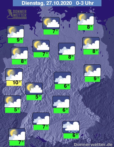 In der Nacht auf Dienstag zeigt sich der Himmel über weiten Landesteilen locker oder aufgelockert bewölkt, zwischen dem West-Havelland und dem Allgäu bleibt der Wolkendecke auch häufig geschlossen. Es bleibt meist trocken, nur am Alpenrand muss in der Nacht immer wieder mit Schauern gerechnet werden.