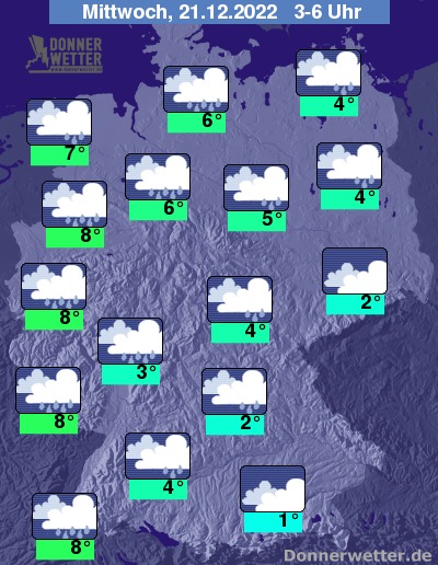 In der folgenden Nacht ist der Himmel verbreitet dicht bewölkt und es fällt zeitweise, teils auch länger anhaltender Regen. Die Temperatur sinkt auf 8 Grad entlang des Rheins und bis 1 Grad im Berchtesgadener Land.