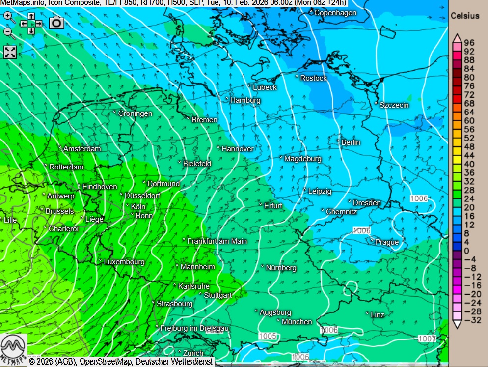 Die Strömungskarten für 06:00 und 18:00 Uhr sowie die Wetterkarte für 06:00 Uhr nach ICON: