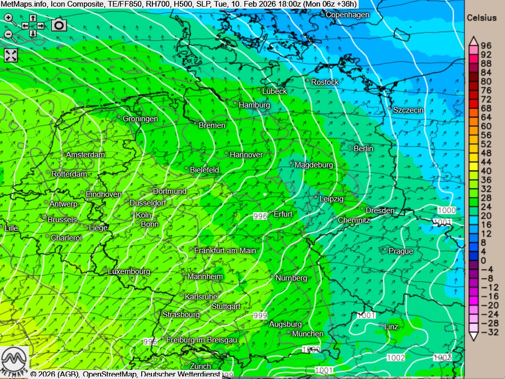 Am Dienstag kann sich im Osten und Südosten zunächst hartnäckiger Nebel oder Hochnebel halten, nachmittags zeigt sich der Himmel hier dann verbreitet heiter und es bleibt trocken. Sonst ist es am Dienstag überwiegend stark bewölkt, dabei fällt von Südwesten Regen, der im weiteren Verlauf auch die Mitte und den Nordwesten erreicht.