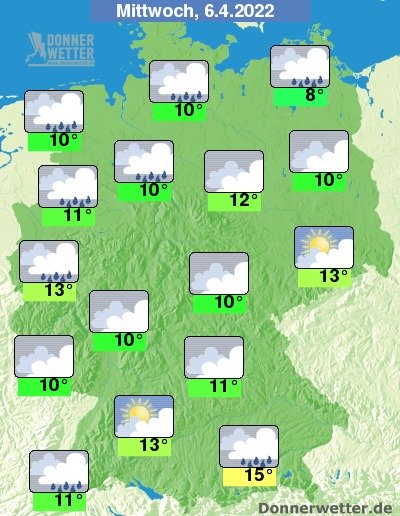 Am Mittwoch ziehen weitgehend dichte Wolken über die Bundesrepublik hinweg, dabei bilden sich gebietsweise Schauer oder es fällt etwas Regen. Die Temperatur steigt auf 8 Grad in Rostock und bis 15 Grad in München. Es weht ein oft stürmischer Wind.