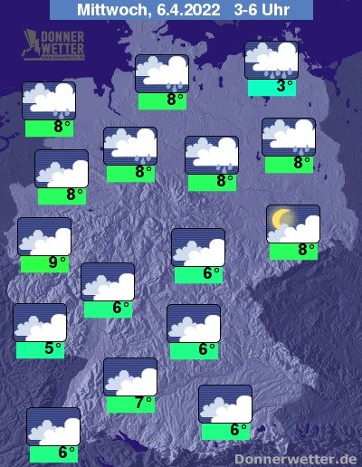 In der folgenden Nacht bleibt die Wolkendecke landesweit verschlossen, dabei fällt im Norden verbreitet Regen, weiter nach Süden hin bleibt es hingegen trocken. Der Wind nimmt im Laufe der Nacht deutlich zu und weht gegen Morgen verbreitet stark und zum Teil auch stürmisch. An der Nordsee herrscht dann Sturm. Die Temperatur sinkt auf 9 Grad in Bonn und etwa 3 in Stralsund.
