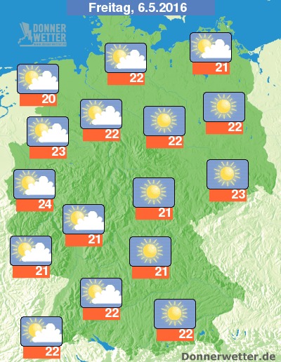 Am Freitag erwartet uns verbreitet sonniges und trockenes Wetter. Vor allem über den Norden und Westen Deutschlands ziehen jedoch auch lockere Wolken hinweg, in den anderen Landesteilen tauchen Wolken seltener auf. Es bleibt überall trocken bei Höchstwerten von 20 Grad an der Nordseeküste und bis 24 Grad in Köln.