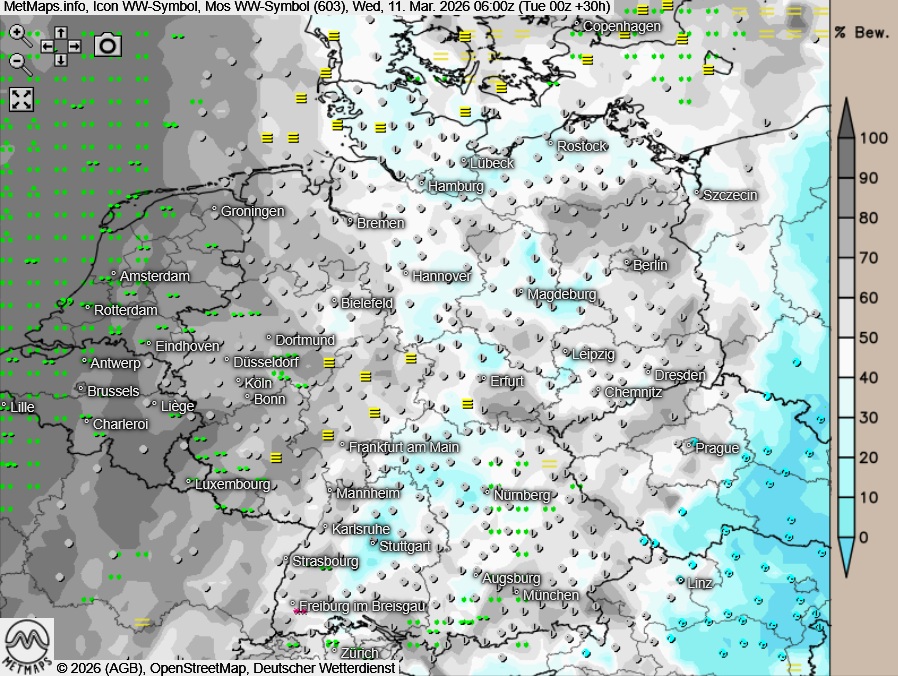Die Temperatur- und Wetterkarte für Mittwochfrüh (06:00 Uhr) sowie die 24-Stunden-Regenmengen für Mittwoch nach ICON: