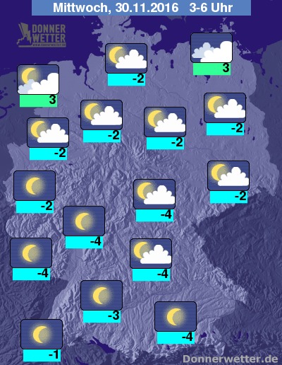 In der kommenden Nacht halten sich im Ostseeumfeld weitgehend dichte Wolken, die hier und da etwas Regen bringen können, auch im übrigen Norden und Osten ziehen zunehmend einige, meist jedoch noch lockere Wolken durch. Überwiegend sternenklar ist es hingegen über dem Süden und Westen Deutschlands, dazu bleibt es trocken. Die Temperatur sinkt auf 3 Grad in Emden und bis -4 Grad im Raum München.