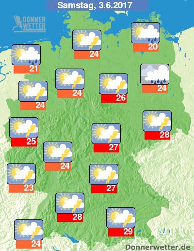 Am Samstag ist es vor allem im Süden zunächst noch verbreitet heiter bis sonnig und trocken, sonst ziehen jedoch bereits zu Tagesbeginn oft viele und zum Teil dichte Wolken übers Land hinweg, dabei sind im Tagesverlauf wiederholt Schauer und auch teils kräftige Gewitter möglich. Die Temperatur steigt auf 20 Grad in Rostock und bis 29 Grad in München.