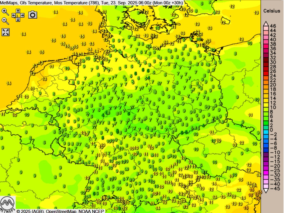 Die Lufttemperaturen und die Wetterkarte für Dienstagfrüh (06:00 Uhr) nach GFS:
