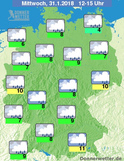 Heute Nachmittag ist es deutschlandweit bedeckt, dabei fällt immer wieder oder langanhaltend Regen. Die Temperatur liegt bei 4 Grad an der Müritz und bis 11 Grad in München. An den Küsten weht ein zum Teil stürmischer Wind.
