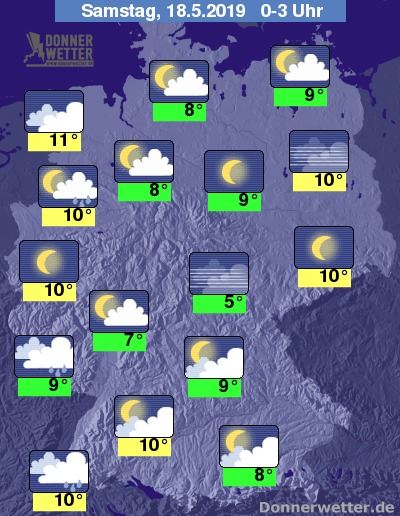 In der Nacht zeigt sich der Himmel über dem Norden des Landes überwiegend locker bewölkt, vereinzelt auch sternenklar; später bildet sich verbreitet Nebel. Im Süden überwiegt wechselnde oder starke Bewölkung. Es bleibt häufig trocken, eine erhöhte Schauerwahrscheinlichkeit besteht für den Nord- und Südwesten Deutschlands.