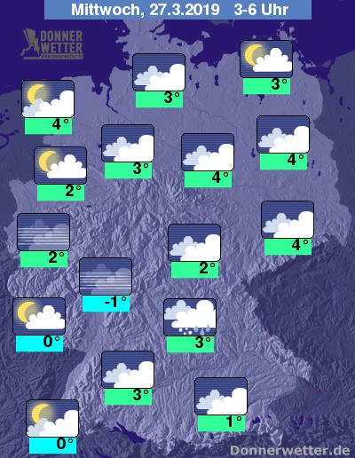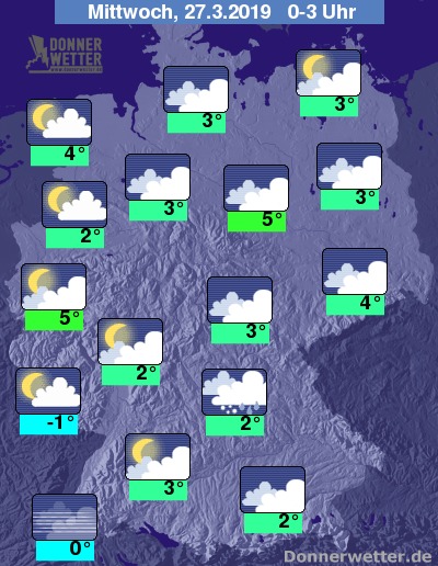 In der kommenden Nacht überwiegt im Osten eine meist geschlossene Wolkendecke. Vor allem in der Westhälfte kann es auflockern. Niederschläge sind meist nicht zu erwarten, nur in Franken kkönnen zeitweise eintelne Schneeregen- oder Regenschauer fallen. Im weiteren Nachtverlauf kann sich gebietsweise Nebel bilden.