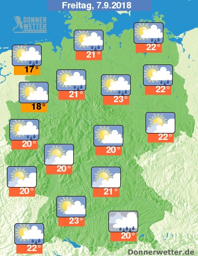 Heute gehen im Osten und Süden noch Regengüsse nieder, vereinzelt auch mit Blitz und Donner. Gleichzeitig ziehen von Benelux neue Schauer in den Norden und Westen. Dazwischen gibt es eine breitere Zone in der es überwiegend trocken bleibt und sich Sonne und Wolken etwa die Waagschale halten. Die Höchsttemperaturen erreichen im Vergleich zu gestern kühlere 17 bis 24 Grad.