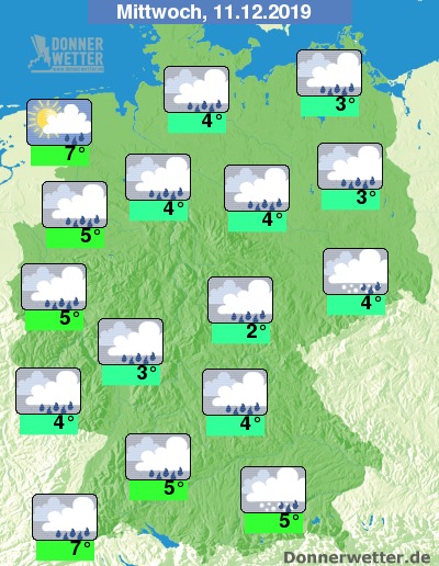 Am Mittwoch bleibt es verbreitet trüb oder bedeckt, im Süden und Osten ist es vormittags noch trocken, sonst fällt aber immer wieder Regen, teils auch Schneeregen oder Schnee. An den Küsten ist es teils stürmisch bei Höchstwerten von 2 Grad im Grabfeld und bis 7 Grad im Oberrheingraben.