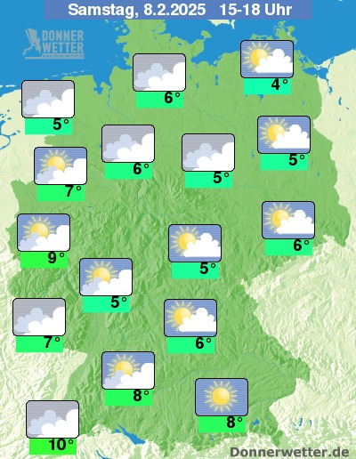 Am Samstagnachmittag kann sich über dem Westen und Nordwesten noch stärkere Bewölkung halten, es bleibt aber meist trocken. In den übrigen Landesteilen zeigt sich der Himmel meist heiter bis wolkig, in Alpennähe ist es auch längere Zeit sonnig.