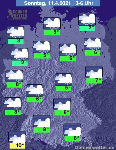 In der Nacht zum Sonntag ist es über dem Süden und über Sachsen stark, teils auch aufgelockert bewölkt und dazu trocken. Im großen Rest des Landes ist der Himmel bedeckt und es fällt verbreitet Regen, im äußeren Westen, Nordwesten und Norden des Landes gehen die Niederschläge zum Teil in Schnee über. Die Temperatur sinkt auf 10 Grad im Breisgau und bis 2 Grad an der Ems.