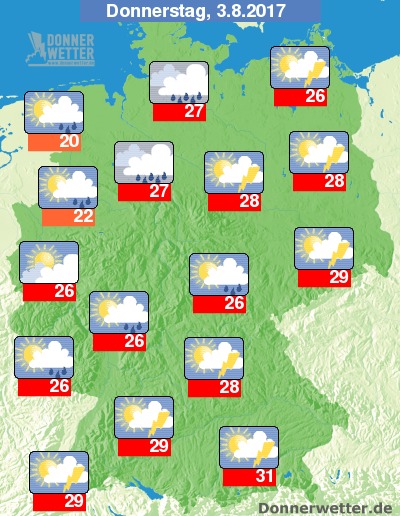 Sonst gibt es eine Mischung aus durchziehenden Wolken und längeren sonnigen Abschnitten. Örtlich können sich teils kräftige Schauer und Gewitter bilden. Dabei wird es mit Höchsttemperaturen zwischen 27 und 34 Grad wieder sehr warm bis heiß und oft auch schwül.