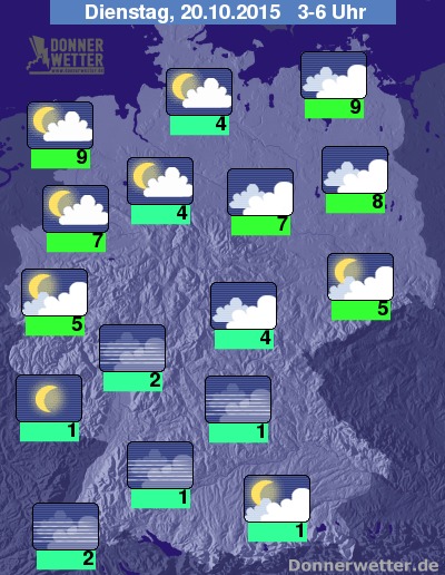 In der kommenden Nacht ziehen über den Osten, die Mitte und den Südosten Deutschlands überwiegend dichte Wolken mit gelegentlich auch etwas Regen oder Sprühregen. Sonst ist es jedoch verbreitet nur locker bewölkt und vor allem im Südwesten und Süden auch oft sternenklar, dazu bleibt es trocken. Die Tiefstwerte liegen bei 9 Grad in Vorpommern und um 1 Grad im südlichen Baden-Würtemberg. Gebietsweise bildet sich Nebel oder Hochnebel, dabei ist stellenweise Glätte durch Rauhreif möglich.