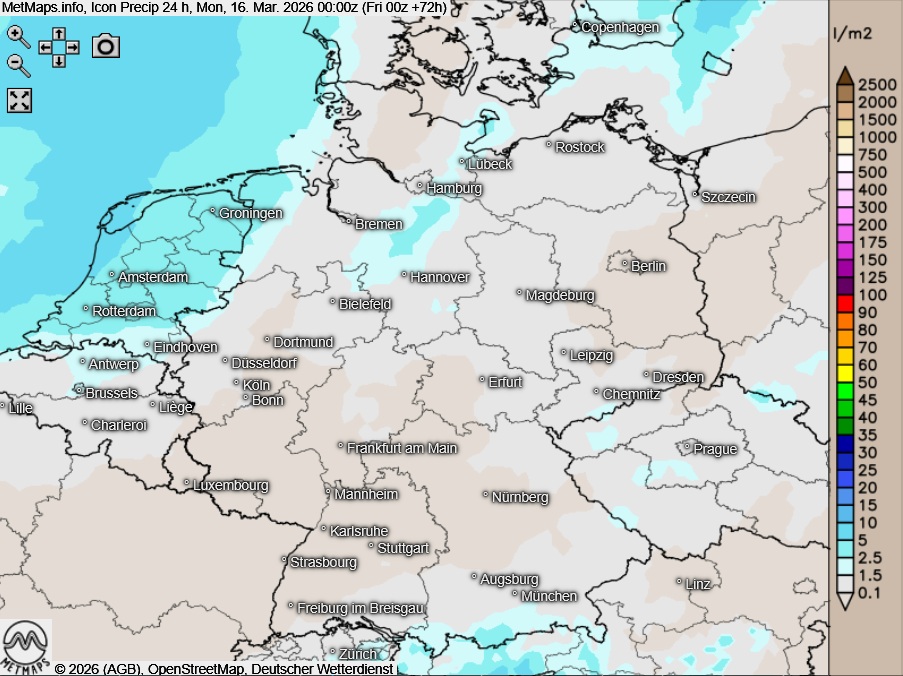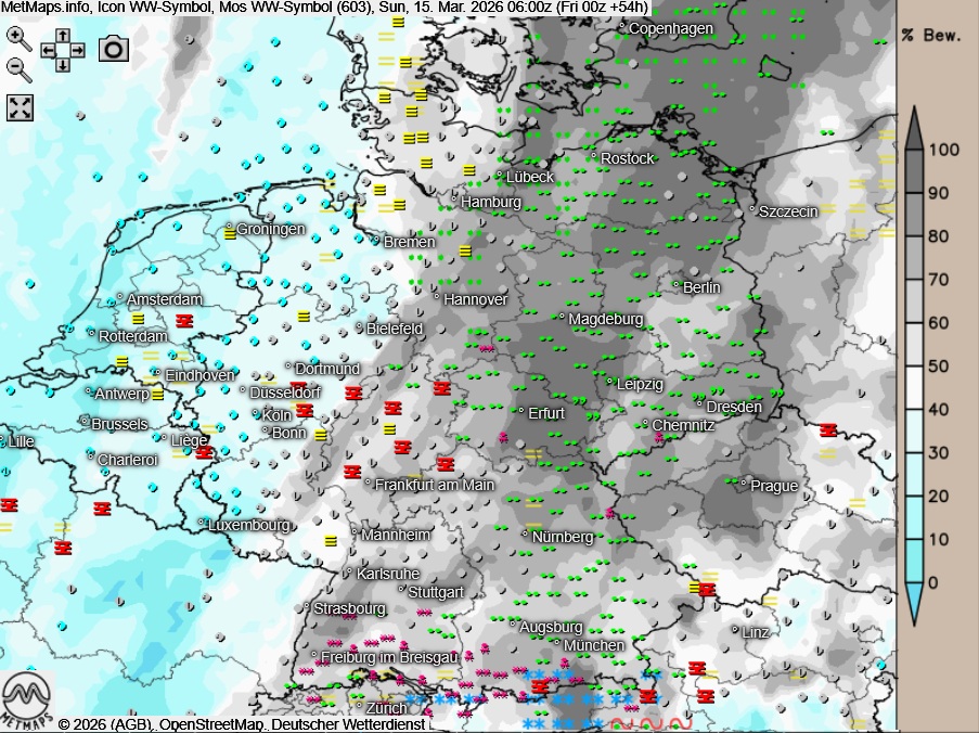 Die Wetter- / Temperaturkarte für Sonntagfrüh (06:00 Uhr) sowie die 24-Stunden-Regenmengen nach Icon: