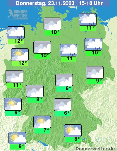 Am späten Abend und in der Nacht auf Freitag greifen Regenfälle vom Norden auf die Mitte des Landes über und erreichen in den frühen Morgenstunden auch den Süden Deutschlands. An den Küsten lockert es nach Durchzug der Regengebiete auch auf. Die Schneefallgrenze sinkt auf etwa 800 Meter. Es bleibt sehr windig, vor allem mit Durchzug der Kaltfront auch stürmisch.