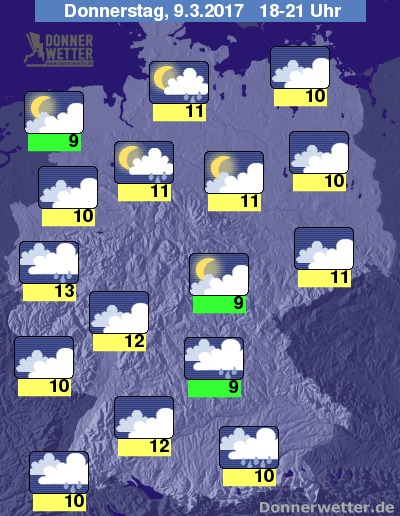 Dabei liegen die Höchstwerte am frühen Abend zwischen 9 Grad in Franken und 13 Grad am Niederrhein.