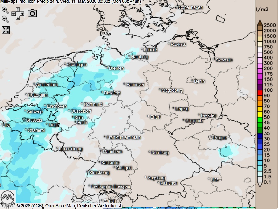 Die Temperaturen erreichen am Nachmittag Höchstwerte um 10 Grad an der Küsten und um 19 Grad im Rhein-Main-Gebiet.