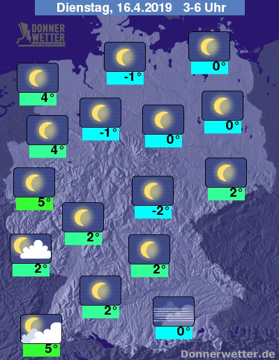 Die Temperaturen sinken bis in die frühen Morgenstunden auf Werte um 5 Grad im Breisgau und um -2 Grad C im Thüringer Wald.