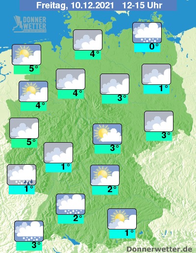 Die Temperaturen erreichen Höchstwerte um 0 Grad an der Ostseeküste, 2 Grad am Alpenrand und um 5 Grad in Rheinland.