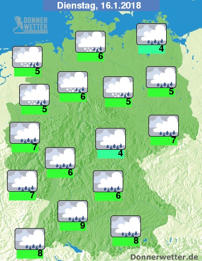 Bei einem lebhaftem und böigen Südwest- bis Westwind ziehen mit Ausnahmen kleinerer Lücken mit etwas Sonne viele kompakte Wolken über Deutschland hinweg, die für schauerartige Niederschläge sorgen. Dabei fällt im Bergland überwiegend Schnee, in tieferen Lagen meistens noch Regen oder Schneeregen. Örtlich drohen auch kurze Gewitter mit Graupel. Die Temperaturen liegen tagsüber in trockenen Pausen zwischen 3 und 10 Grad, wobei die höchsten Werte am Oberrhein zwischen Basel und Karlsruhe zu finden sind. Auf den Höhen der Mittelgebirge werden nur wenige Grade über dem Gefrierpunkt gemessen.
