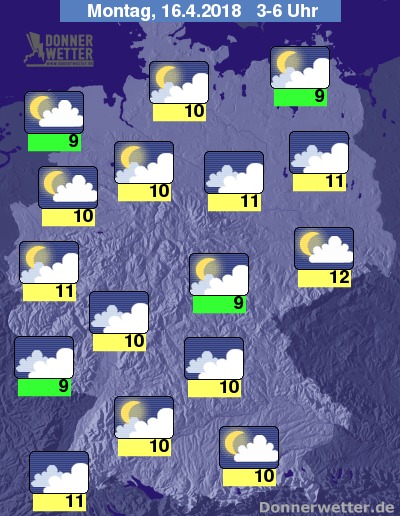 In der Nacht zum Montag klingen auch letzte Schauer im Norden rasch ab, der Himmel zeigt sich dann verbreitet aufgelockert, gebietsweise auch stark bewölkt, dazu bleibt es trocken. Die Temperatur sinkt auf 12 Grad in Dresden und bis 9 Grad am Pfälzer Wald.