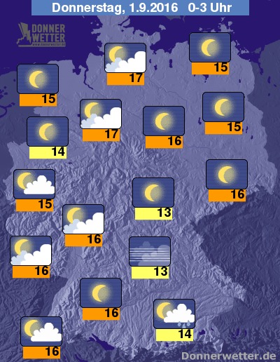 Die Temperaturen sinken im Nachtverlauf auf Werte um 16 Grad C an der Elbe und um 13 Grad C im Münsterland.
