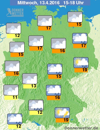 Am Donnerstag im Westen und Südwesten teils einige Wolken, teils heiter und meist trocken, sonst häufig stark, teils aufgelockert bewölkt, gebietsweise Schauer, selten auch Gewitter, 12 bis 17 Grad.