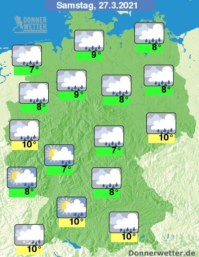 Am Samstag ist es überwiegend stark, nur vorübergehend ist es auch aufgelockert bewölkt. Dabei bleibt es im Süden zumeist trocken, während sich sonst wiederholt Schauer bilden, zum Teil mischt sich auch Graupel und Schnee in die Niederschläge. Die Temperatur steigt nur noch auf 7 Grad in Erfurt und bis etwa 10 Grad entlang des Rheins.