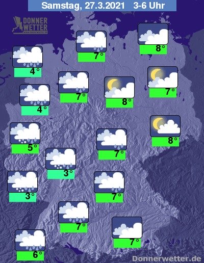 In der kommenden Nacht ziehen von Westen her dichte Wolken durch und nur im Südosten, Osten und Nordosten bleibt es bis zum Morgen noch weitgehend trocken. Im übrigen Bundesgebiet fällt zeitweise Regen, zum Teil mischt sich auch Schnee oder Graupel mit in die Niederschläge. Die Temperatur sinkt auf 8 Grad an der Neiße und bis 3 Grad im Saargau.