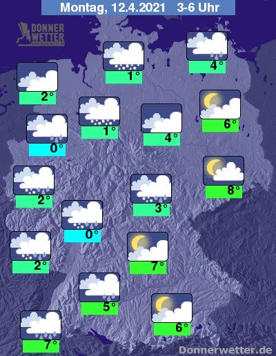 In der folgenden Nacht ist der Himmel über dem Süden und Osten noch oft aufgelockert bewölkt, dazu bleibt es hier vorerst trocken. Weiter nach Nordwesten hin bleibt es meist stark bewölkt und es fällt zeitweise Regen, Schneeregen oder Schnee. Bis zum Morgen erreichen die Niederschläge auch den Süden und Osten der Republik, während von Nordwesten her die Niederschläge abklingen und es im Norden und Westen immer weiter auflockert. Die Temperatur sinkt auf 8 Grad in Dresden und 0 Grad in Münster.