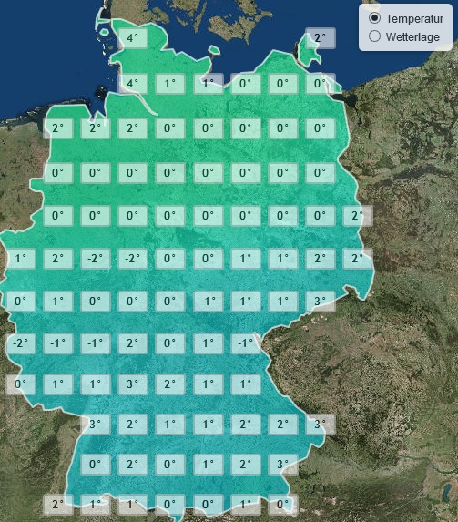 Die Höchsttemperaturen erreichen dazu Werte um die 2 Grad an der Ostsee und bis zu 5 Grad am Niederrhein.