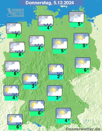 Am Donnerstag kann besonders im Süden und Osten noch gebietsweise die Sonne scheinen. Ansonsten ist es aber schon meist stark bewölkt, jedoch zumindest anfangs noch trocken. Im Tagesverlauf zieht dann von Westen her Regen auf. Anfangs fällt auch noch teilweise Schnee. Die Temperatur erreicht 2 Grad im Eichsfeld und bis 7 Grad im nördlichen Emsland. Es ist generell windig, an der Nordsee weht oft stürmischer Wind.