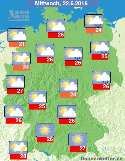 Am Mittwoch zieht im Osten und Nordosten, zum Teil auch im Norden teils aufgelockerte, teils starke Bewölkung durch, dabei sind hier einzelne Schauer zu erwarten. Gewitter sind möglich, bleiben jedoch selten. Im übrigen Bundesgebiet ist es verbreitet heiter bis sonnig, hier und da ziehen auch mal mehr Wolken durch, dabei bleibt es, von vereinzelten Schauern oder Gewittern abgesehen, bis zum Abend trocken. Die Temperatur steigt auf 21 Grad in Ostfriesland und 28 Grad im Breisgau.