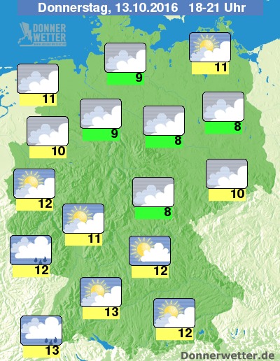 Auch am Abend bestimmen in den meisten Landesteilen dichte Wolken das Bild am Himmel. Zwischen Pfalz und Schwarzwald regnet es auch vereinzelt. Die kurzen sonnigen Abschnitte verlagern sich hingegen zunehmend in den Südosten des Landes. Die Höchstwerte liegen am frühen Abend noch bei rund 8 Grad im Osten und bei bis zu 13 Grad im Südwesten.