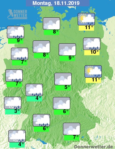 Heute halten sich oft dichte Wolken und es fällt zeitweise Regen, in höheren Lagen auch Schneeregen oder Schnee. Im Tagesverlauf lockert die Bewölkung im Osten, teils auch im Süden phasenweise auf, zeitweise fällt aber auch hier weiterer Regen. Die Temperatur steigt auf 3 Grad am Pfälzer Wald und bis 11 Grad in Neubrandenburg.
