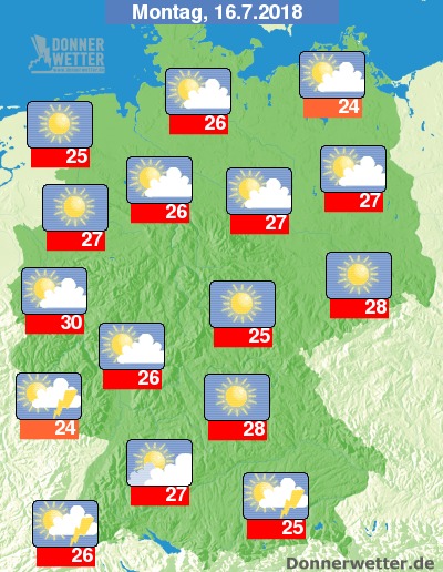 Am Montag zeigt sich das Wetter meist heiter bis sonnig, hier und da ist es wechselnd bewölkt. Im Süden und Westen ziehen zum Teil auch dichte Wolken auf, über dem Alpenvorland bilden sich dazu gebietsweise Schauer und Gewitter, sonst bleibt es trocken. Die Temperatur steigt auf 24 Grad am Pfälzer Wald und bis 30 Grad im Rheinland.