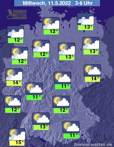 In der folgenden Nacht ist es über dem Norden aufgelockert bis stark bewölkt und dazu weitgehend trocken. Weiter nach Süden hin ist der Himmel häufig locker und sonst wechselnd bewölkt, dazu bleibt es trocken. Die Temperatur sinkt auf milde 15 Grad im Breisgau und bis 11 Grad im Grabfeld.