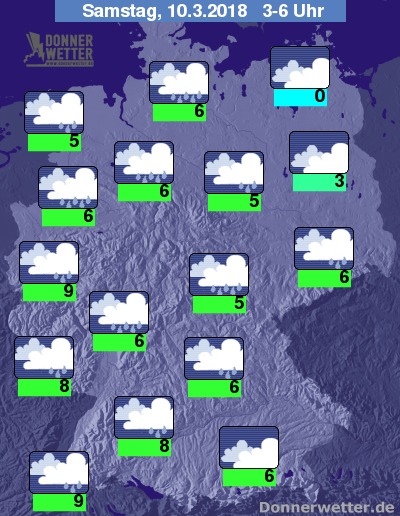 In der kommenden Nacht halten sich verbreitet dichte Wolken, dazu bleibt es im Alpenvorland und im Nordosten des Landes trocken, sonst fällt hingegen zeitweise Regen. Die Temperatur sinkt auf 9 Grad im Breisgau und bis 0 Grad in Vorpommern.