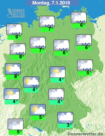 Zum Start in die neue Woche bleibt das Wetter die meiste Zeit über stark bewölkt und zeitweise fällt dazu auch Regen. Im Süden fällt überwiegend Schnee. Die Temperatur erreicht 3 Grad in München und etwa 9 Grad in Wilhelmshaven.
