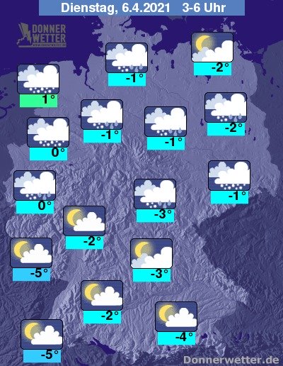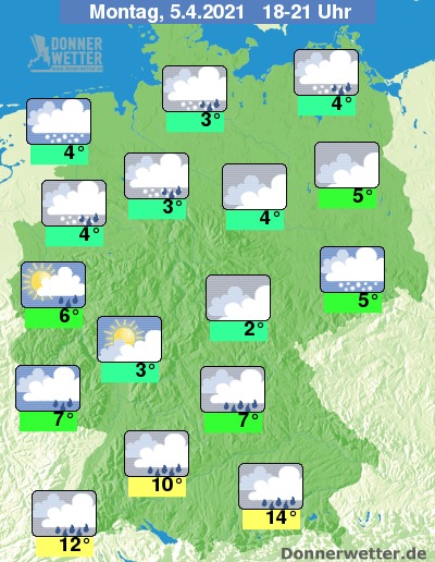 Heute Abend klingen die Schauer zum Großteil ab, vor allem im Norden und Nordwesten bilden sich jedoch weiterhin Regen-, Schneeregen-, Schnee- oder Graupelschauer, im Süden fällt zeitweise Regen, im weiteren Verlauf gehen die Niederschläge hier zum Teil in Schnee über. Der Wind weht im Norden und Westen noch teils stark und an den Küsten auch stürmisch. Die Temperatur liegt bei 2 Grad in Jena und bis zu 13 Grad in München.