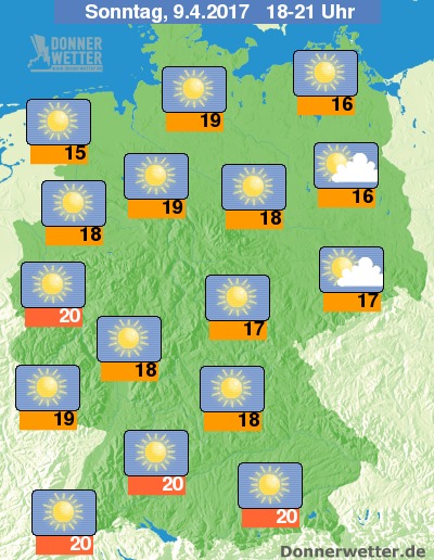 Heute Abend ist es über dem Land verbreitet nur sonnig und trocken. Im Osten ziehen hier und da noch lockere Wolken durch. Es bleibt überall trocken bei 15 Grad in Emden und bis 20 Grad in München und Köln.